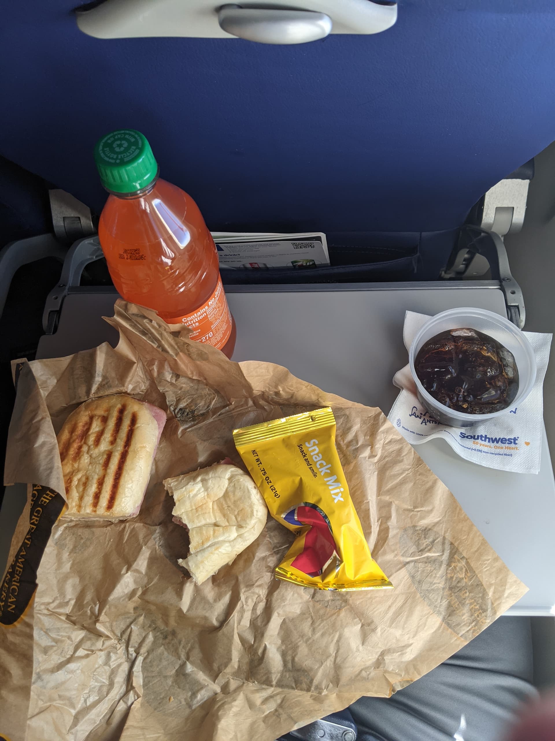 Got myself a Ham and Swiss panini with an orange Fanta prior to boarding that I promised myself I’d eat on the plane (and not before). Flight attendants came by with Southwest Snack Packs, and a drink of your choice, I chose Coke of course! Really good stuff for a lunch miles above Earth!